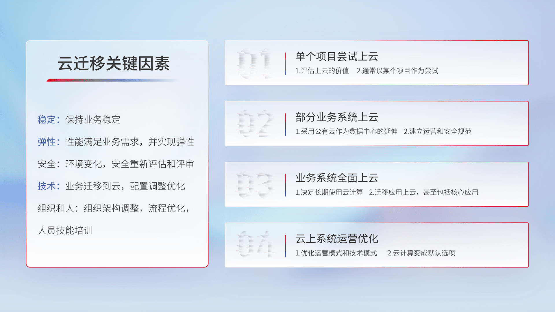 结合实际业务,,,,从规划设计、、、云平台选型、、、、云原生改造、、、、数据迁移、、、、集成交付,,,迁移全过程为客户识别最佳上云路径,,,做好风险识别管理,,设计网络架构、、、身份权限、、、、安全审计合规、、、操作审计、、日志审计、、监控告警策略、、、、多站点容灾设计等,,对云上基础设施进行整体规划,,,提升IT治理水平,,,,以满足弹性、、、高可用、、高性能的需求。。
